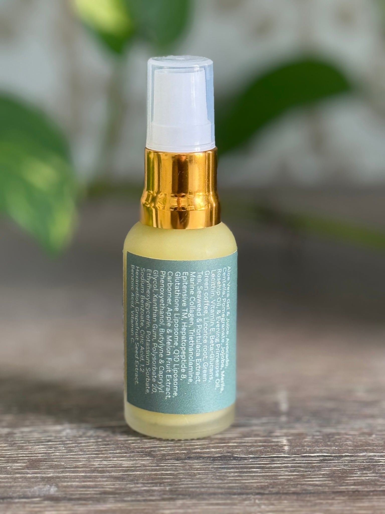 Aloe Vera Gel & Juice, Avocado, Centella, Pomegranate, Jojoba, Merila, Rosehip Oil, & Evening Primerose Oil, Lecithin, Vitamin E, Beta-Glucans, Green coffee, Licorice root, Green Tea, Seaweed & Portulaca Extract, Marine Collagen, Triethanolamine, Epitensive TM, Hepatopeptide 8, Glutathione Liposome, Q10 Liposome, Carbomer, Apple & Melon Fruit Extract, Phenoxyethanol, Butylyne & Caprylyl Glycol, Xanthan Gum, Polysorbate 20,
